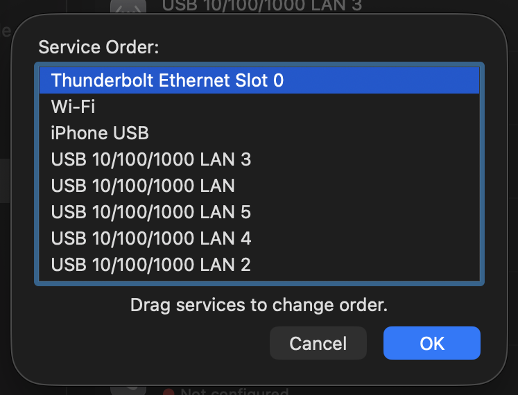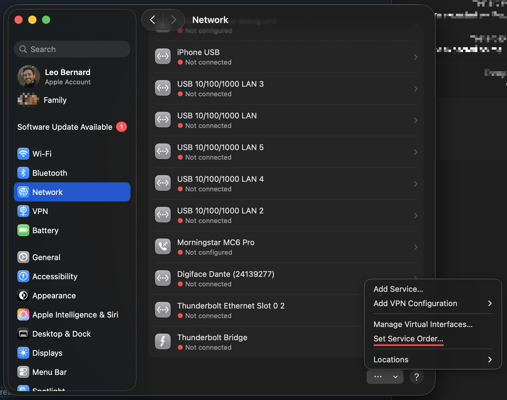 In the meantime, AbleSet always chooses the system’s default network interface if no override is set. On macOS, you can change the default interface by opening System Settings, selecting Network in the sidebar, clicking the three dots at the bottom of the interface list, and selecting “Set Service Order…”