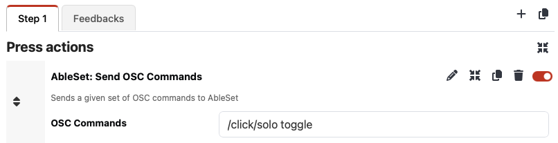 This is a bug in how the Companion Module works with the current version of AbleSet. To work around this, you could replace the action of the button with a “Send OSC Commands” action and set the “OSC Commands” field to /click/solo toggle.