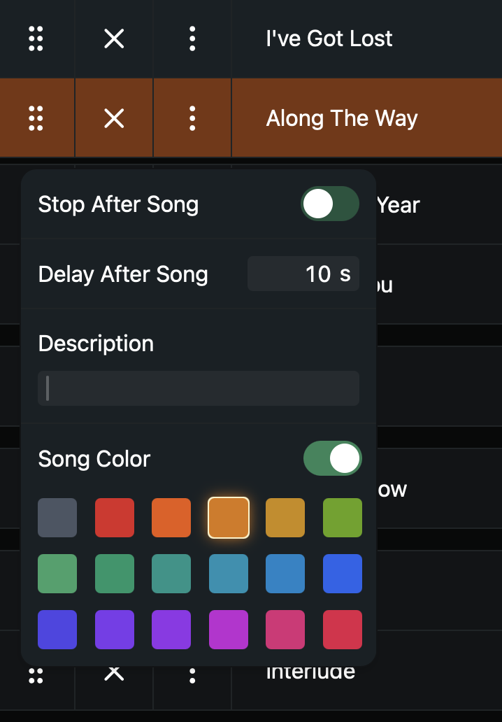 AbleSet 3 will support adding a delay after a song from within the setlist, along with other per-song customizations: