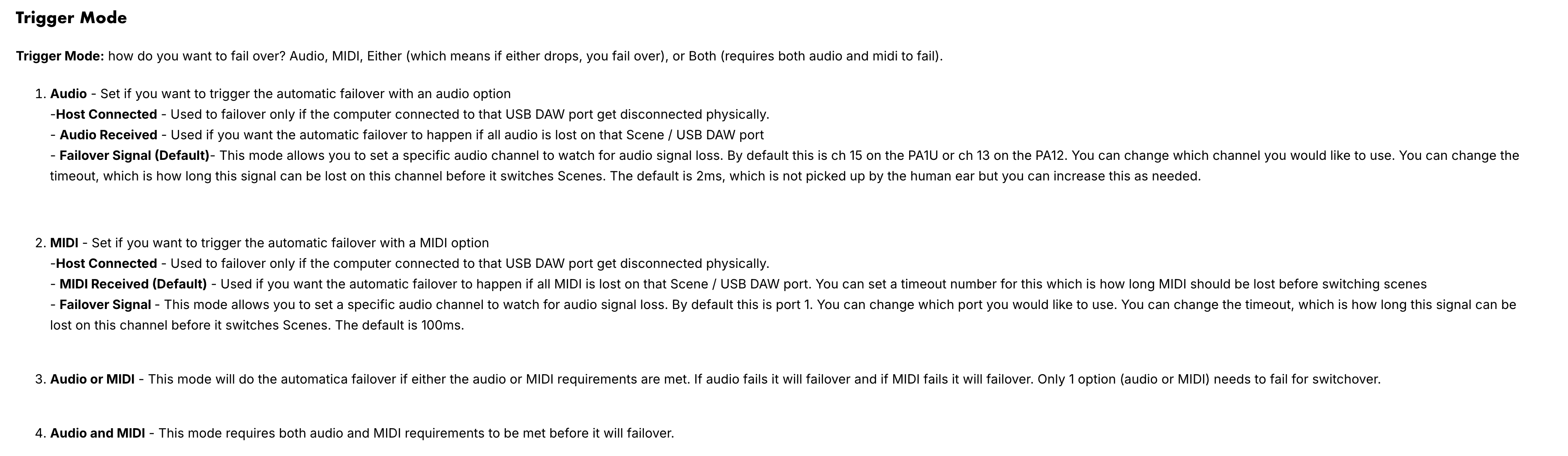 Hey all! I hope this isn’t overlapping with other requests or scripts that have been already built, but I’m looking for help with our current playback rig. We switched over midyear last year to running audio for playback and keyboard rigs with a DirectOut Prodigy, but still kept our PlayAudio1U as a redundant MIDI interface. Because we’re using the Prodigy for audio, we can’t feed a lifesine signal to the PA1U (without messing with aggregate devices in MacOS). We have a lot of MIDI automation in our show file, and ideally we’d like the scene on the PA1U to follow the audio failover from the Prodigy.