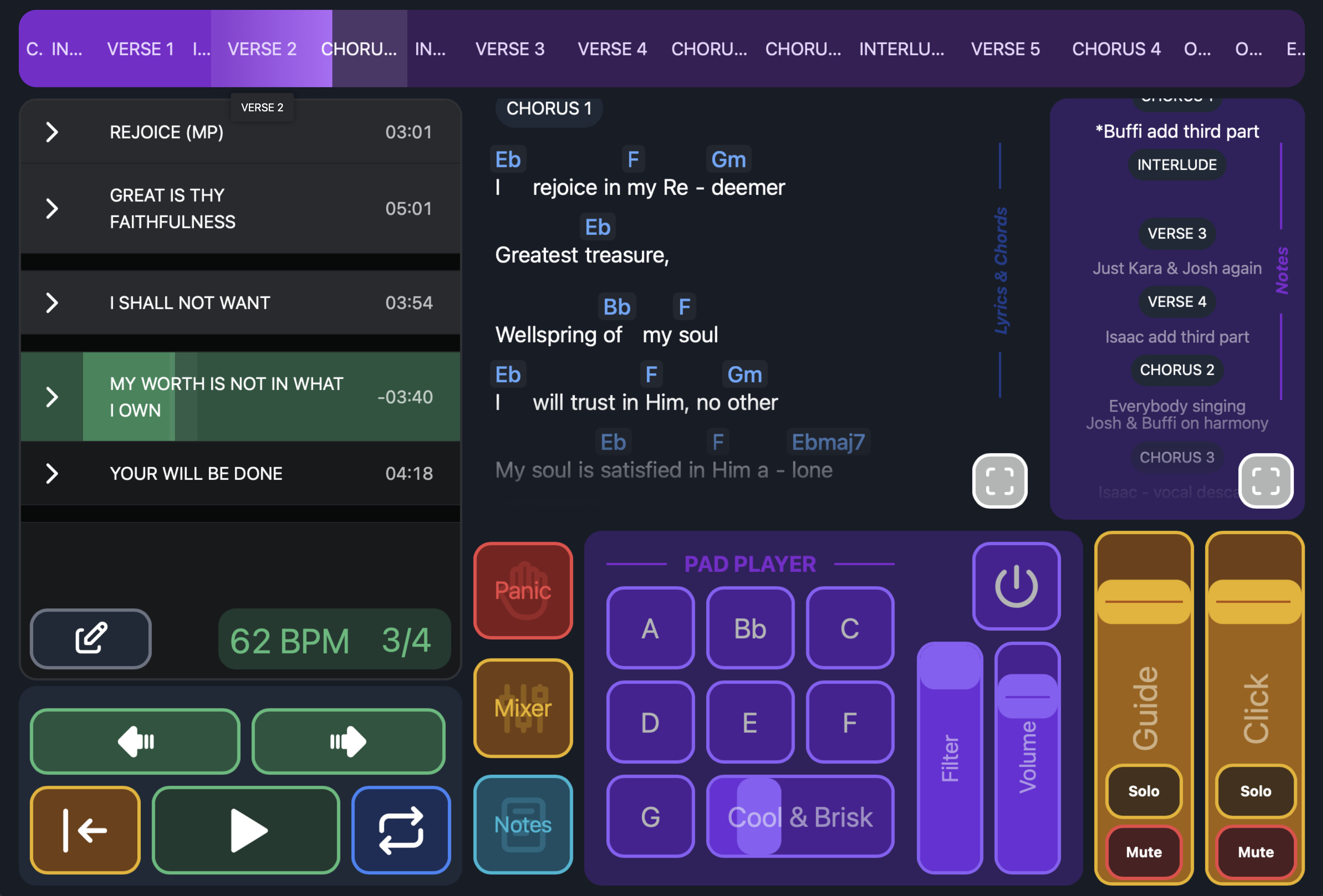 The tempo and time signature labels have a visual metronome behind them, since sometimes I forget what time signature we’re in when transitioning from one song to another.