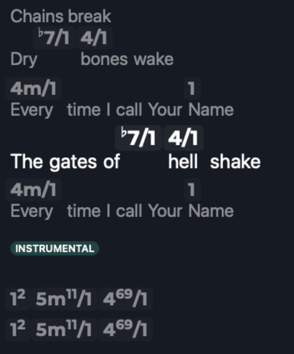 Hey! I’m loving everything about how lyrics work but I was wondering if there was a way to transcode the format of the chords when viewing them. For example, instead of showing standard chord names like [Em] [C] [G], could there be an option to view them with the Nashville Number system like [6] [4] [1]? I’ve seen a few ChordPro programs implement that and was just wondering if that was a possibility or if that has already been implemented. Thanks again for the help!