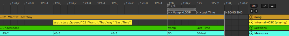 - “/setlist/jumpBySections 2 true” works well when playing from the previous song