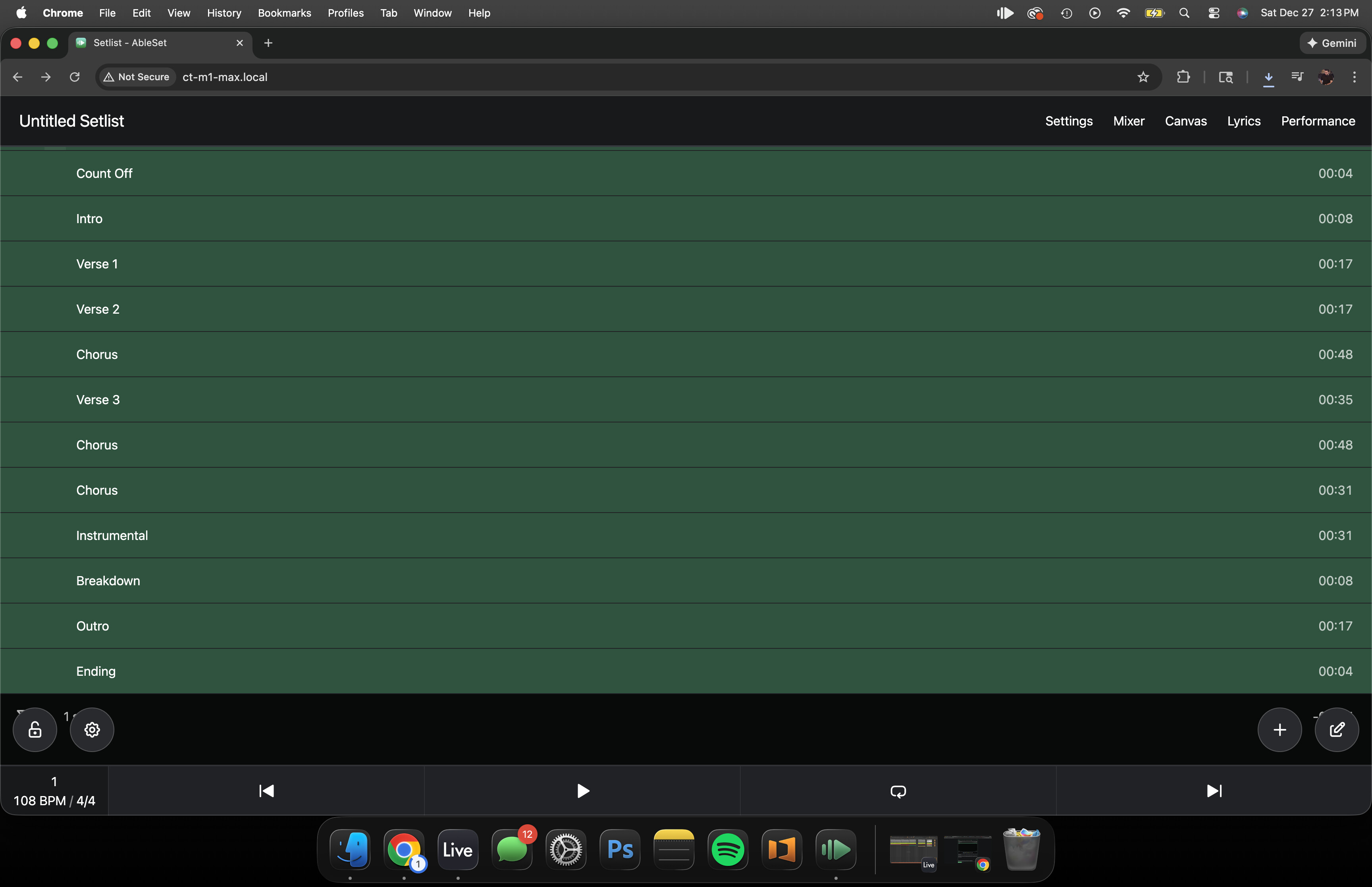 The pictures above shows the Ableton project and the Ableset correlation. In the past I’ve had each song post in a color with its own Sections being able to choose. The sections here are only for the first song.