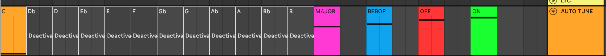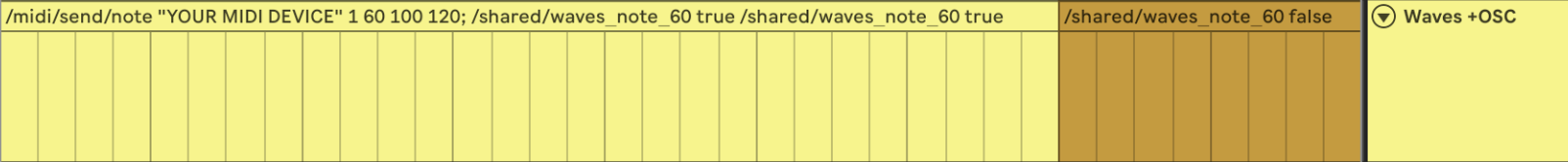 Alternatively, you could split your MIDI track into three tracks – one per “category” of commands. Then rename the clips to the note they send and name your track like this: AUTO TUNE NOTE +OSC [/shared/autotuneNote], AUTO TUNE SCALE +OSC [/shared/autotuneScale], AUTO TUNE ACTIVE +OSC [/shared/autotuneActive].