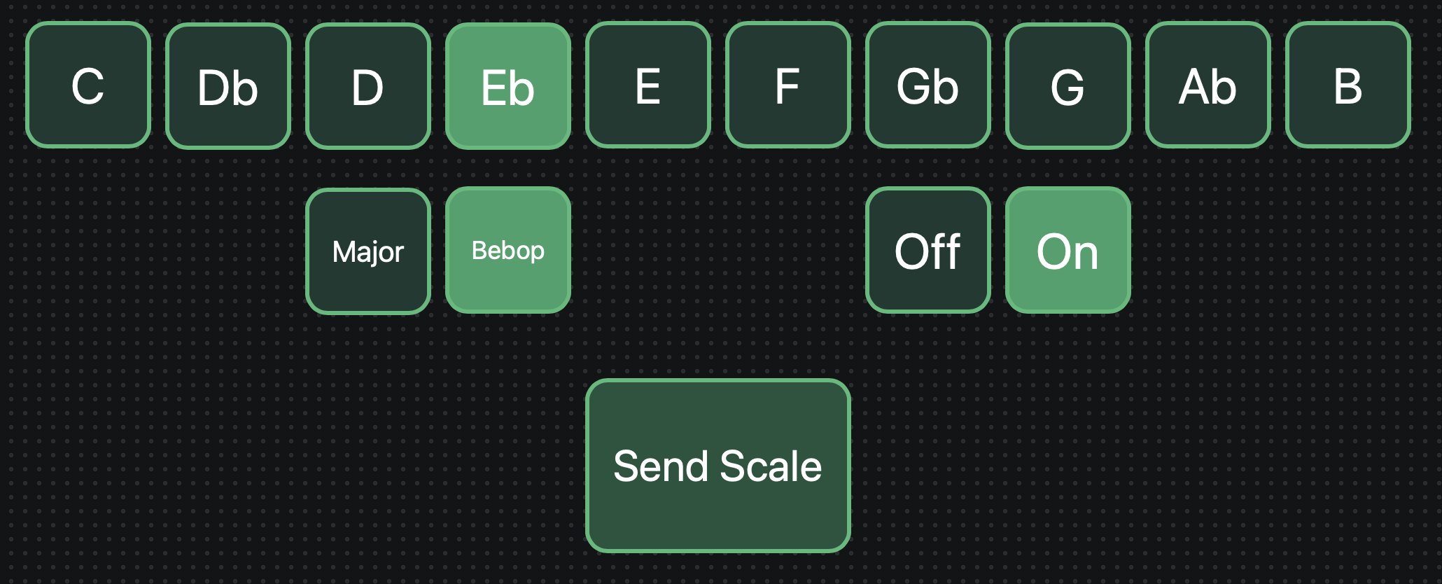 This canvas lets you select the root note, scale, and state, and activate it by tapping “Send Scale”. I wasn’t sure which notes you were sending to the other computer, so I took a guess: