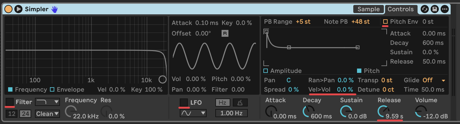 Go to the controls tab, disable everything you don’t need (e.g. Filter, LFO, Pitch Env), set the Velocity → Volume knob to 0%, and set the Release time to however long you want your fade-out to be. I’ve put it around 10s for this example: